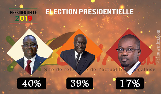 Présidentielle 2019 : Voici les résultats définitive, alors 2nd tour forcément 25 février 2019 La rédaction Actualités, Politique 0 PREMIÈRES TENDANCES: MACKY 40%, IDY 39%, SONKO 17%